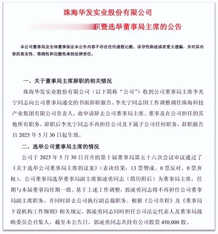 新的华发股份董事长是来自华发股份董事局副主席、执行副总裁的郭凌勇,也是华发集团旗下另外一个开发运营公司华发城市运营集团的董事长。